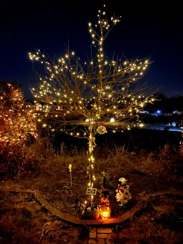 Each December we hang solar powered Christmas lights from Regan's tree and throughout the garden to provide a beacon of light during the winter months.